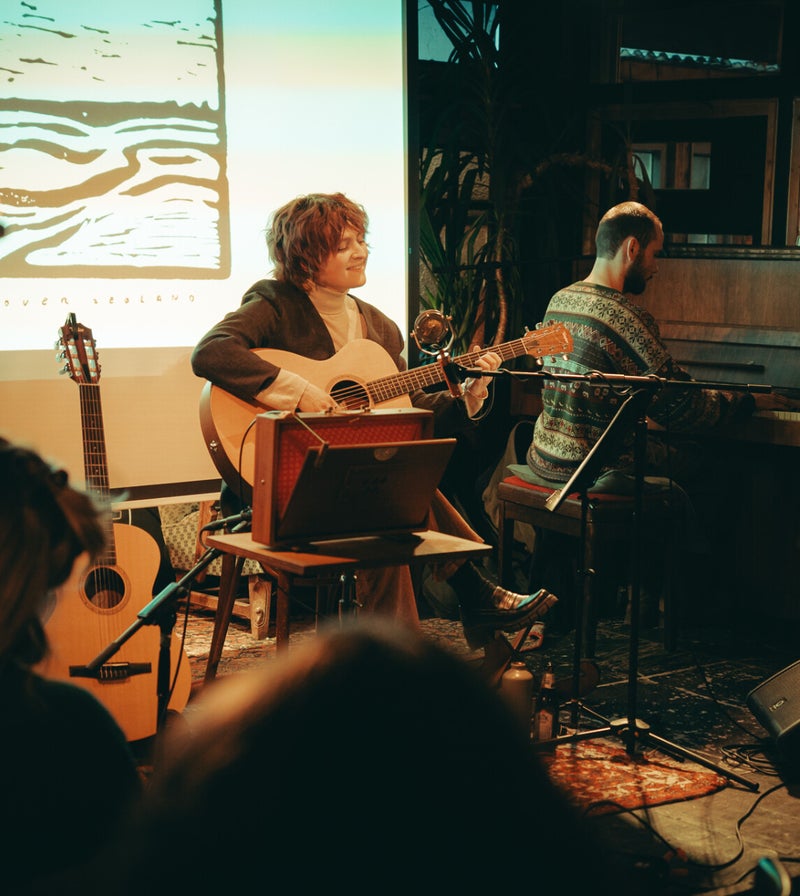 As a teenager she travelled the country by train; watching landscapes and people go by while scribbling down poems in notebooks. These journeys sparked her imagination and a curiosity about life that still fuels her writing today. Encouraged by a friend who was a photographer at a music venue, she began sharing her songs and words with the world in 2014. Her first time on stage with original material was a terrifying yet natural experience, marking the start of her love-hate relationship with performing. Her passion for songwriting, music, and language continued to grow as she performed at local venues and travelled across the country by train, taking her poems and songs with her to share wherever she went.